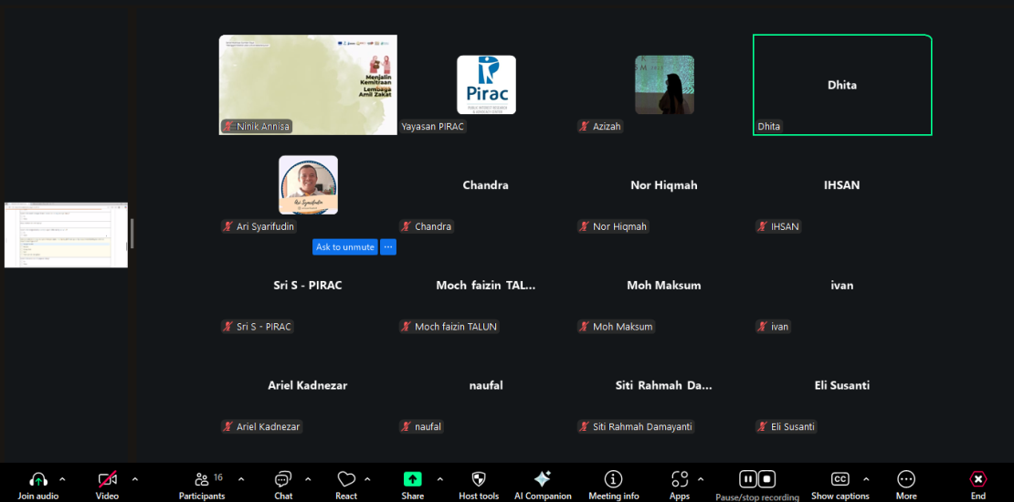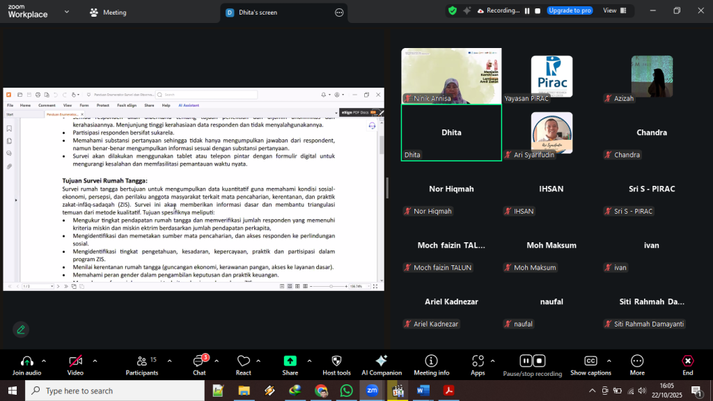 Depok, Indonesia – Pada hari Rabu (21/10/2025), PIRAC (Public Interest Research and Advocacy Center) bersama Yayasan Islamic Relief Indonesia (YIRI) menggelar pertemuan koordinasi daring untuk mematangkan studi dasar program Pemberdayaan Keluarga Miskin Ekstrem (Make Extreme Poverty History Through Poor Graduation Approach (MEMPHIS-PGA)). Diskusi yang berlangsung secara virtual ini menunjukkan komitmen serius tim dalam memastikan metodologi, instrumen, dan proses pengumpulan data berjalan akurat dan terkoordinasi. Diskusi dilakukan secara online menggunakan platform Zoom Online yang dihadiri 16 peserta diskusi. Peserta diskusi begitu antusias menikmati pemaparan dari Ninik Annisa dan Dhita.
